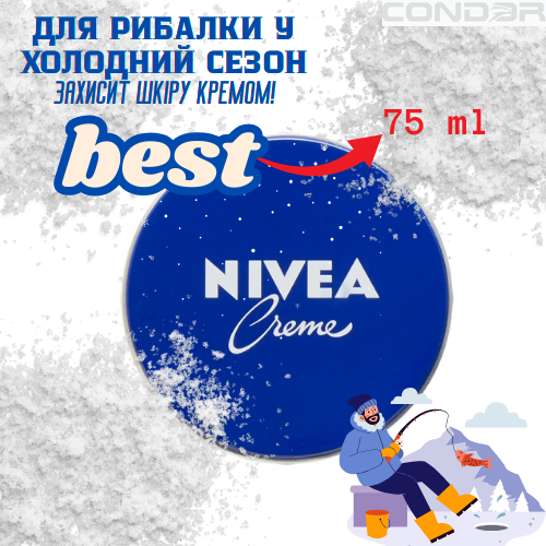 Універсальний зволожуючий крем NIVEA Creme: ідеальний помічник для рибалки у холодний сезон Рибалка в холодну пору року – справжнє випробування для шкіри. Морозний вітер, волога та тривале перебування на вулиці призводять до обвітрювання, сухості та подразнення шкіри. Універсальний крем NIVEA Creme стане незамінним супутником рибалки, забезпечуючи надійний захист та догляд. Переваги для рибалок: